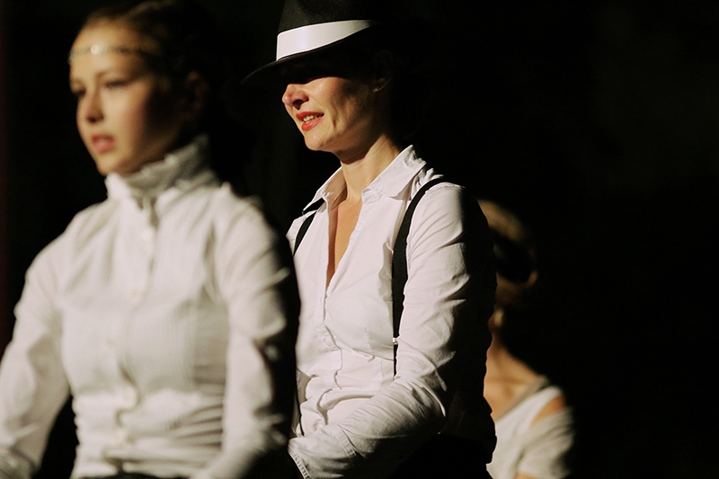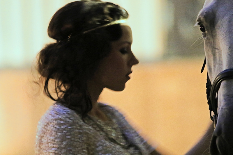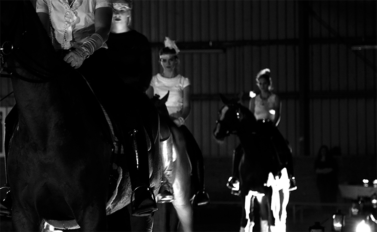 Die Nocturnes wurden jeweils Samstag 5., 12. und am 19. September 2015 zu vorgerückter Stunde in der Reithalle des Ländlichen Reitvereins Berlin Tegel aufgeführt. Zehn Reiterinnen – Frauen ganz unterschiedlichen Alters und viele Pferdebeine bei spärlicher Beleuchtung. Sehr wenig Licht seitlich von unten, dazu raumbildend eingesetzte Laternen mit Kerzenlicht, um die herum mit Pferden vom Boden aus und geritten, Aufgaben der hohen Dressur vorgestellt werden. Weiße iberische Hengste, französische Ponys und deutsche Sportpferde in einem minimalistischen Bühnenbild mit einer kleinen Bistroszenerie vor einer Leinwand und projezierten Foto- und Filmeinspielungen. Die Musik ist facettenreich, meist elektronisch; sie unterstreicht die schwungvolle Bewegung der Pferde. Schwarz, Weiß, Rot mischen sich mit den Erd-, Metall- und Holztönen der Reithalle. Szenerie, Musik, Maske, ein teils leicht androgynes vom Stil der 20er Jahre inspiriertes Kostümbild sind nie zu viel. Alles ist stimmig und ergibt zusammen ein schönes Gemälde aus Licht und Schatten, Dynamik und Rhythmus.