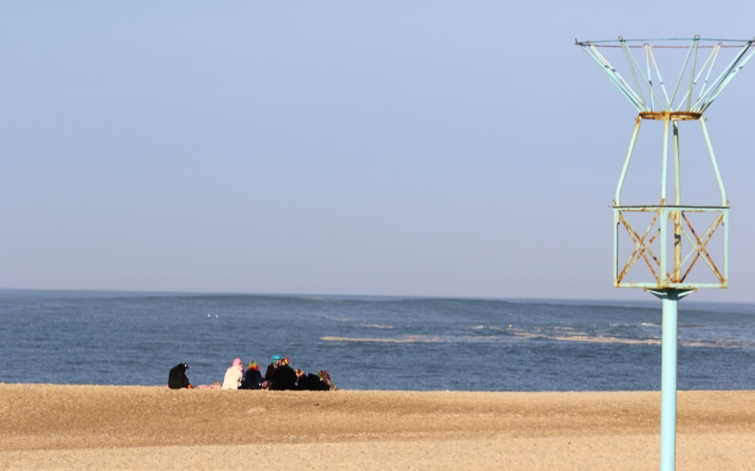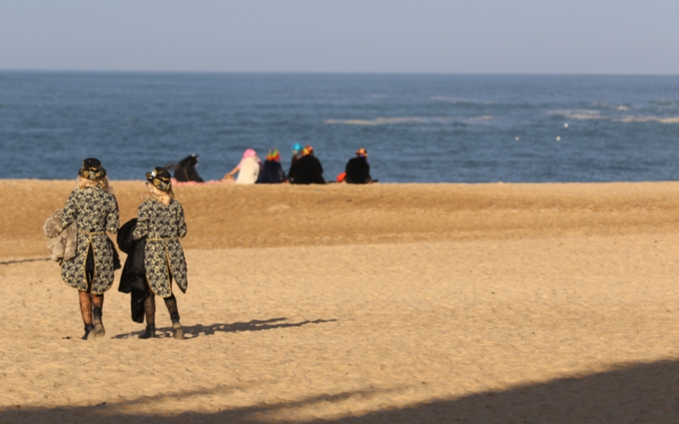 Als ich aus der Halle heraustrete nieselt es leicht. Die Sicht ist nicht klar. Etwas dunstig ist es. Ich laufe auf der Promenade den Strand entlang, durch die noch verschlafene Stadt. Mir gefällt diese Stimmung. Manchmal tauchen vereinzelt Karnevalisten auf. Gruppen verkleideter Jugendlicher am Strand. Piraten, Clochards und Prinzessinnen. Es ist das Karneval-Wochenende, an dem nicht nur im Rheinland die Narren los sind. In Nazaré geht es etwas zurückhaltender zu. Die gespielte Musik klingt wie eine sympathische Mischung aus Folklore und Punkrock. Einzeln versprengte Karnevalisten erzeugen eine irgendwie surreale Atmosphäre in dem relativ verlassenen Urlaubsort.