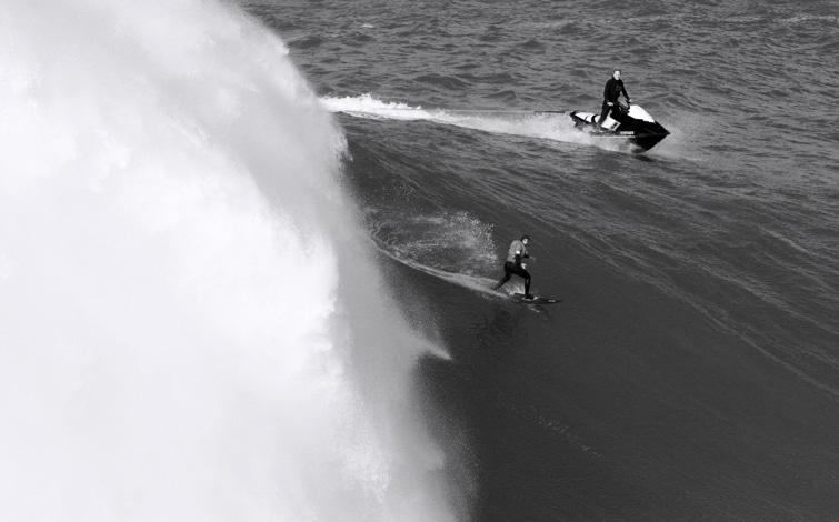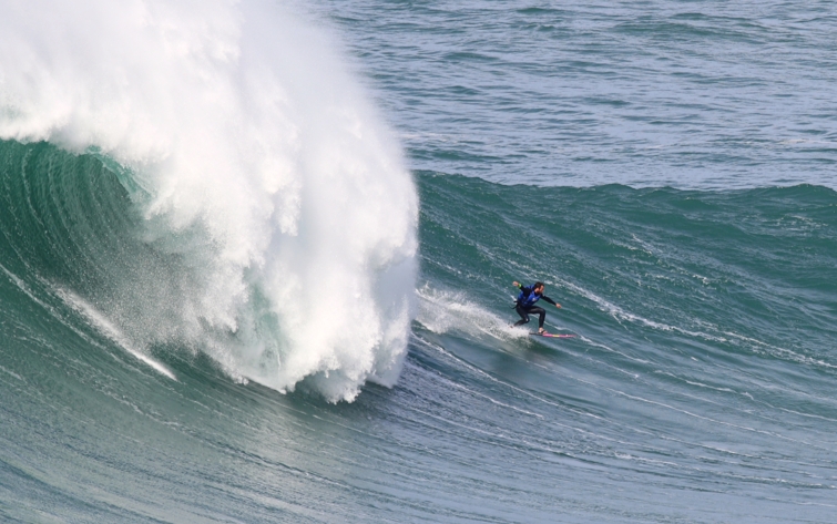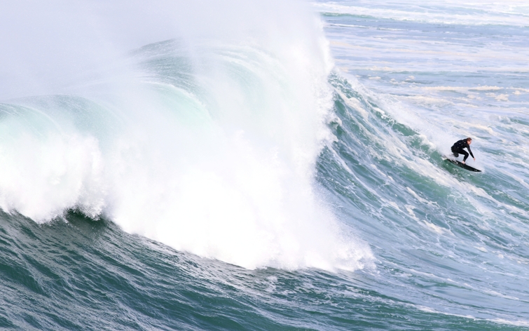 Es ist Bewegung im Meer. Zwei Personen preschen mit einem Jetski Richtung Landspitze samt Festung. Jetzt schnell ins Auto und herauf zum Nordstrand fahren. Praia do Norte, ist zum Markenzeichen geworden. Der Name des Strands symbolisiert über die Grenzen Europas hinaus, Begeisterung für das Big Wave Surfen.