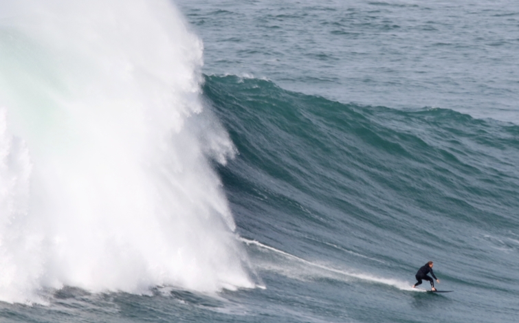 Sonntag-Vormittag noch einmal Surfaction. Heute sind die Wellen größer, nicht ganz so aufgewühlt und die Sicht ist klarer. Helles Licht, die Sonne scheint. Und heute sehe ich auch Sebastian Steudtner einige Wellen surfen. Diese Wellenritte dauern so lange an, dass mir die Arme schwer werden unter der Last des großen Objektivs. Teilweise bewegen sich die Wassersportler sehr weit hinaus auf den Atlantik. Erschreckend und beeindruckend zugleich, wenn die Kräfte des Ozeans sich so gewaltig äußern. Das Vermögen der bekannten Big Wave Surfer mit den Naturgewalten umzugehen, ist offenbar immens. Akribische Vorbereitung und die ideale technische Ausrüstung ermöglichen es den Extremsportlern, derartige Wellen und deutlich größere Berge aus Wasser zu bezwingen.